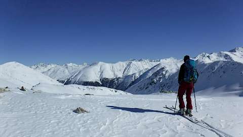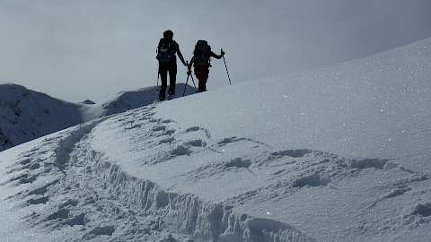Voraussetzungen: Kurven in paralleler Skistellung im Gelände in jeder Schneeart. Tiefschnee-Erfahrung ist unbedingt erforderlich. Gute Kondition für lange Skitage und bis zu 5000 Tm.