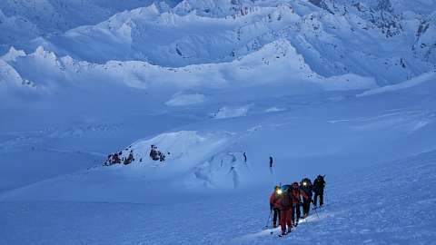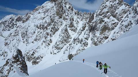 Voraussetzungen: Technisch anspruchsvolle Skihochtouren für erfahrene Skibergsteiger, vielfach über Gletscher. Trittsicherheit, Schwindelfreiheit und Kondition für Aufstiegszeiten von bis zehn Stunden, 1900 Hm und für entsprechend lange Abfahrten auch in grosser Höhe bringen Sie mit. Einige Gipfel verlangen leichte Gratkletterei auch mit Steigeisen, auf dem Gletscher kann auch einmal eine Seilsicherung notwendig werden. Die höchste Übernachtung erfolgt auf 3700 Metern. Vorakklimatisation empfohlen.