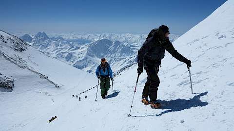 Eine Skitour zum Elbrus – mit 5642m der höchste Berg Europas und einer der „Seven Summits” – ist eine ganz besondere Herausforderung für passionierte Skibergsteiger. Aber auch die Eingehtouren im Adyrsu-Tal mit seinen einsamen und unberührten Schneehängen sind schon die Reise wert. Bestens vorbereitet, beginnt am fünften Tag das Unternehmen Elbrus: Vom Ausgangslager "Botschki" 3700m zum höchsten Punkt. Läuft alles wie geplant, gibt es noch zwei Touren im Baksan-Tal als schöne Zugabe obendrauf. Gipfelmöglichkeiten: Koiavgan-Pass 3559m, Gumachi-Pass 3540m, Granovskovo-Pass 3759m, Akklimatisationstour zu den Pastuchovfelsen 4680m, Elbrus Westgipfel 5642m, Tscheget 3461m, bei guten Verhältnissen Kleiner Kogutai 4694m.