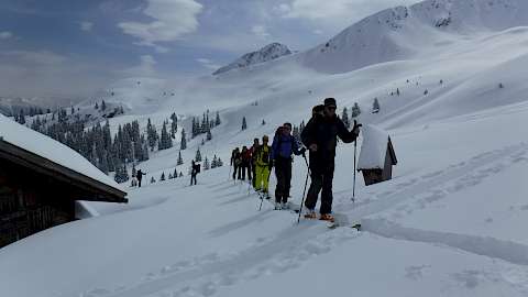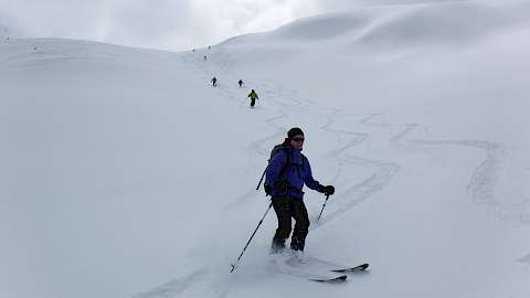 Voraussetzungen: Tiefschnee-Erfahrung ist unbedingt erforderlich. Sie fahren Kurven im Tiefschnee in mittelsteilem Gelände in paralleler Skistellung, aus Sicherheitsgründen gelegentlich in der Spur des Bergführers. Gute Kondition für Aufstiege von vis zu 1000Hm und damit verbundene Abfahrten.