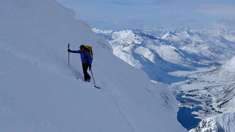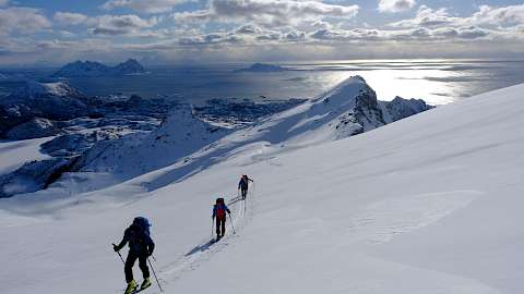 Die Inselgruppe der Lofoten, etwa 200 km nördlich des Polarkreises gelegen, ist für ihre Naturschönheiten bekannt und einer der ursprünglichsten Orte für außergwöhnliche Skitouren. Die rund 80 Inseln erstrecken sich auf einer Länge von 120 Kilometern im Atlantik vor Norwegens Westküste und sind vom Festland durch den Vestfjord getrennt. Die teils schroffen Berge der Lofoten sind bis zu 1200 m hoch. Auf unseren abwechslungsreichen Skitouren eröffnet sich ein oft spektakuläres Panorama zwischen schneebedeckten Gipfeln, türkisfarbenen Buchten und bunten Fischerhäusern. Vielerorts sind Abfahrten bis zum Meer möglich.