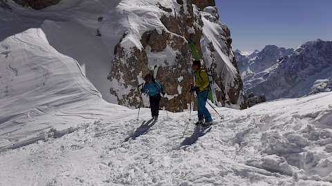 Voraussetzungen: Skitourenerfahrung. Sie fahren Kurven im Tiefschnee in mittel steilem Gelände in paralleler Skistellung in jeder Schneeart. Falls erforderlich in der Spur des Bergführers. Gute Kondition für Austeige von bis 1350Hm und entsprechende lange Abfahrten.