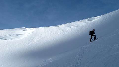 Voraussetzungen: Kurven im Tiefschnee in paralleler Skistellung, falls erforderlich in der Spur des Bergführers, Skitouren-Erfahrung. Gute Kondition für Aufstiege von bis zu 1500 Hm und Abfahrten von bis zu 1950 Tm.