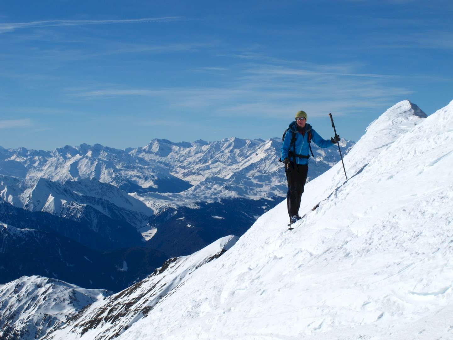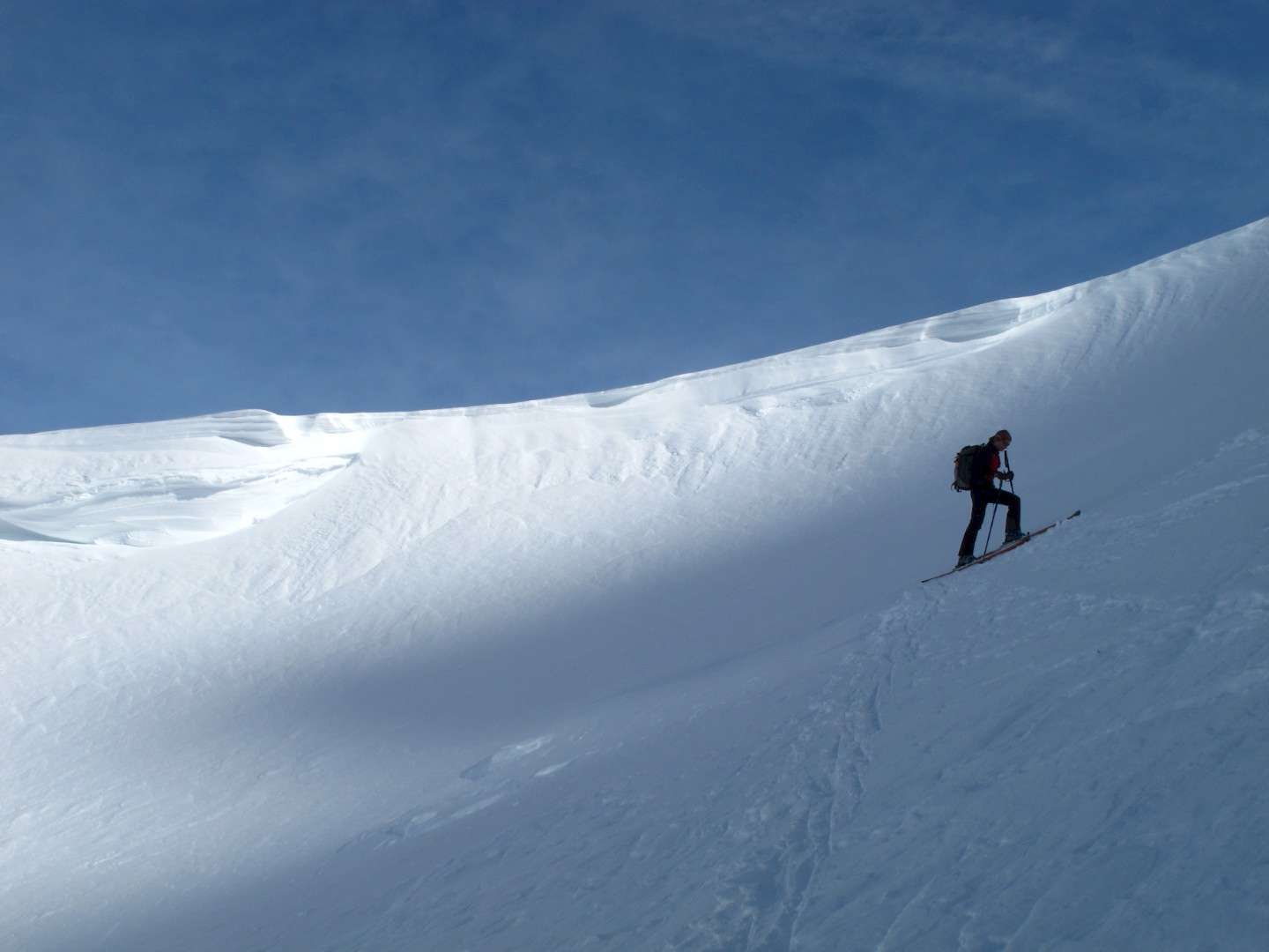 Voraussetzungen: Kurven im Tiefschnee in paralleler Skistellung, falls erforderlich in der Spur des Bergführers, Skitouren-Erfahrung. Gute Kondition für Aufstiege von bis zu 1500 Hm und Abfahrten von bis zu 1950 Tm.